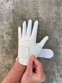 First, make sure that all 3 velcro straps are "free" and not suck to the glove. Then, slide the glove on and attach velcro strap 1 over the top of your hand.